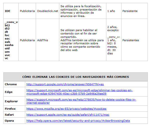 Las cookies y otras tecnologías similares tales como local shared objects, flash cookies o píxeles, son herramientas empleadas por los servidores Web para almacenar y recuperar información acerca de sus visitantes, así como para ofrecer un correcto funcionamiento del sitio.